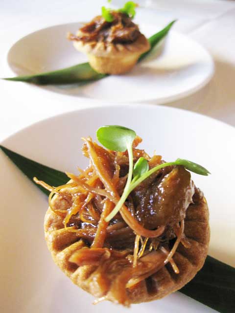 the spiced duck confit tarts were little cups of sweetened shredded duck meat. a bit sweet for my taste, but my guest ate two. oink.